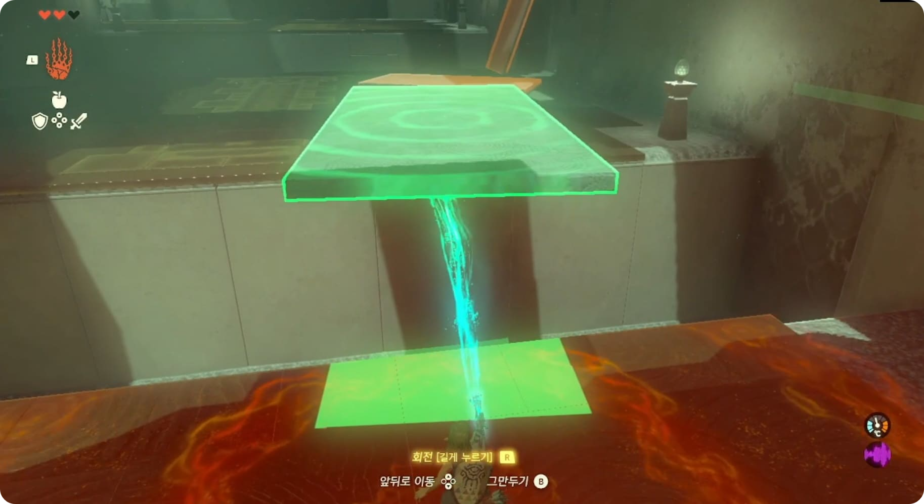 1. '울트라 핸드'를 사용해 입구 오른쪽에 있는 돌판을 다리처럼 만들어 이동합니다.
