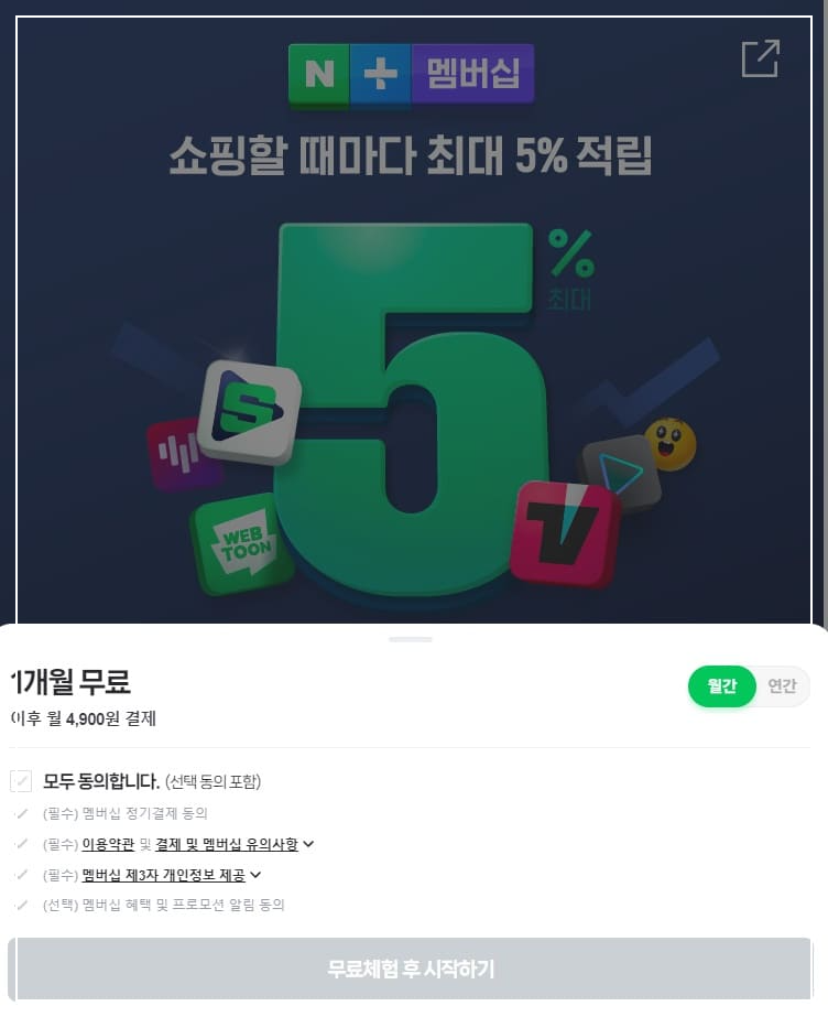 네이버 플러스 공식 홈페이지에 접속해 아이디와 비밀번호를 입력해 로그인을 합니다. 그리고 1개월 무료 월간을 클릭해 필수 항목들을 동의하면 무료체험후 시작하기를 선택하면 됩니다. 티빙에 있는 영상들을 한 달 동안 원하는 영상들을 이용해 본후 유료전환의 할 것인지 결정하면 됩니다.
